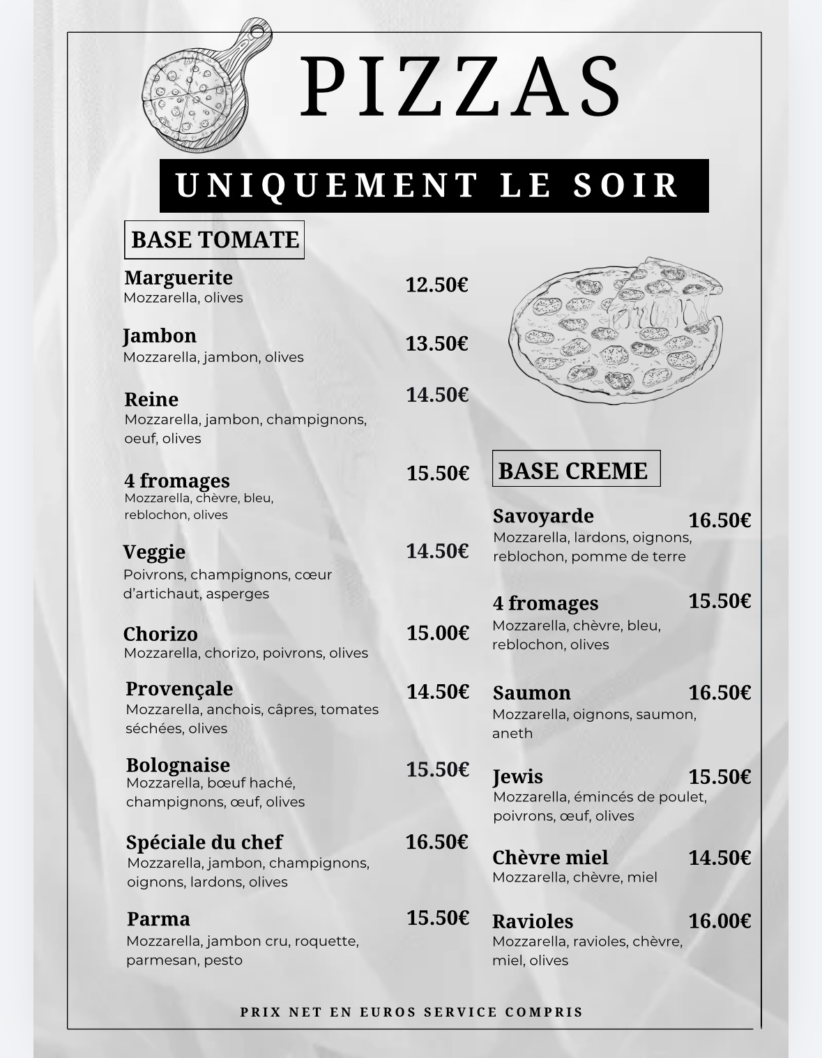 Nous vous proposons une sélection de pizzas faites maison disponibles tous les soirs sur place ou à emporter à partir de 19h15.